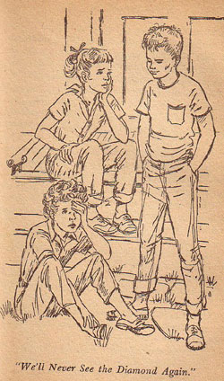 Trixie and Honey find a diamond embedded in the dirt floor of the Wheeler's gatehouse and involve the newly formed Bob-Whites of the Glen in a chase to catch a crook.